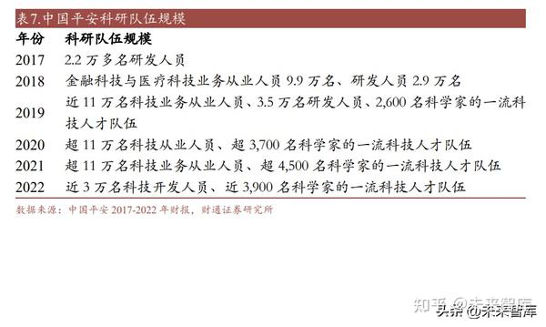 中国平安是业内领先的科技型保险公司,坚持科技赋能金融、科技促进发展。2017 年,平安正式确定“金融+科技”双驱动战略,以人工智能、区块链、云、大数据 和安全五大核心技术为基础,深度聚焦金融科技与医疗科技两大领域,以科技赋 能金融发展。 公司坚持研发投入,科技人才与专利技术大幅领先同业。2018 年公司管理层表示, 之后每年将会按收入的 1%持续投入,未来十年的科技投入总额至少千亿。与此同 时,公司科研团队持续扩容,截至 2022 年,已形成了一只囊括近 3 万名科技开发 人员、近 3900 名科学家的一流科技人才队伍,驱动科技专利持续增长,至 2022 年,公司累计专利已达 4.6 万件,其中 2022 年新增 7657 件,在人工智能技术领 域、金融科技和数字医疗业务领域的专利申请数排名均为全球第一位。