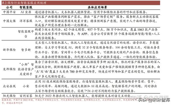 AI客服是当前AI在保险行业运用最为广泛的场景之一,能够综合应用语音识别、 语义理解、语音合成、OCR、人脸识别、电子签名等多项人工智能技术,为客户 提供咨询(包括保险种类、保险期限、保险条款、保费等)、外呼及回访等众多繁 琐的客户咨询和业务处理,提高客户满意度和保险销售效率。 但当前 AI 客服仍是一种基于规则或预定义脚本的自动化程序,只能执行特定的 任务,客户需求超过其预设能力范围后便无法给出解决方案,与生成式 AI 所能带 来的客户体验仍有较大差距。