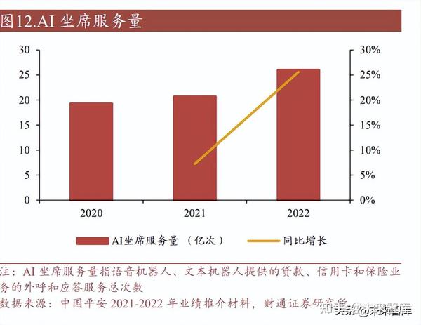 AI 坐席赋能:通过 AI 技术赋能人工坐席,2022 年 AI 坐席服务量约 26.0 亿次, 同比增长 26%,覆盖平安 82%的客服总量;AI 坐席驱动产品销售规模约 3444 亿 元,同比增长 25%,在整体坐席产品销售规模中占比 48.5%,同比上升 19.2%; AI 催收覆盖率为 49%,同比上升 20%;AI 催收的 30 日回退率为 72%。②2021年,平安寿险 AI 视频机器人辅助完成近 80%新契约回访任务,同比提升 20 个 百分点。